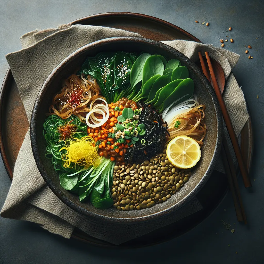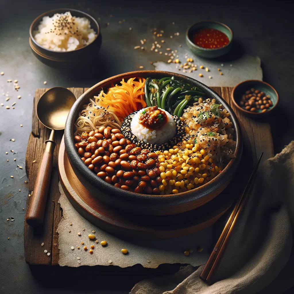 Doenjang Lentil and Radish Kimchi Bibimbap with Sesame Ginger Sauce is a delightful fusion of traditional Korean flavors with a modern twist. This dish features