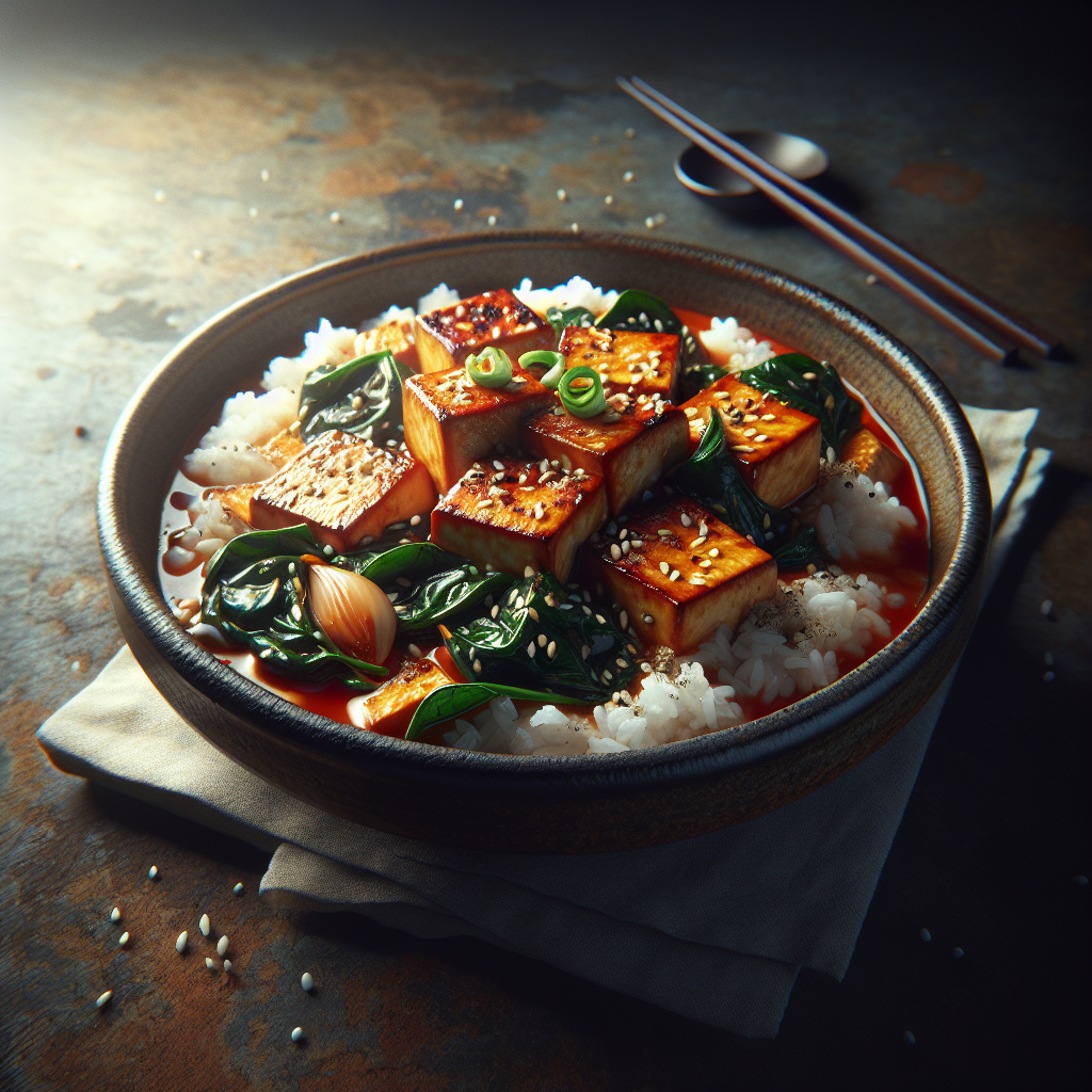Doenjang Marinated Tofu Stew with Sesame Garlic Spinach is a delightful Korean dish that combines the rich umami flavors of fermented soybean paste with the