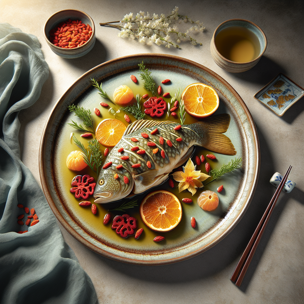 Osmanthus-Infused Halal Grouper with Goji Berry and Tangerine Peel Essence is a delightful Chinese dish that marries aromatic and floral notes with the rich, clean