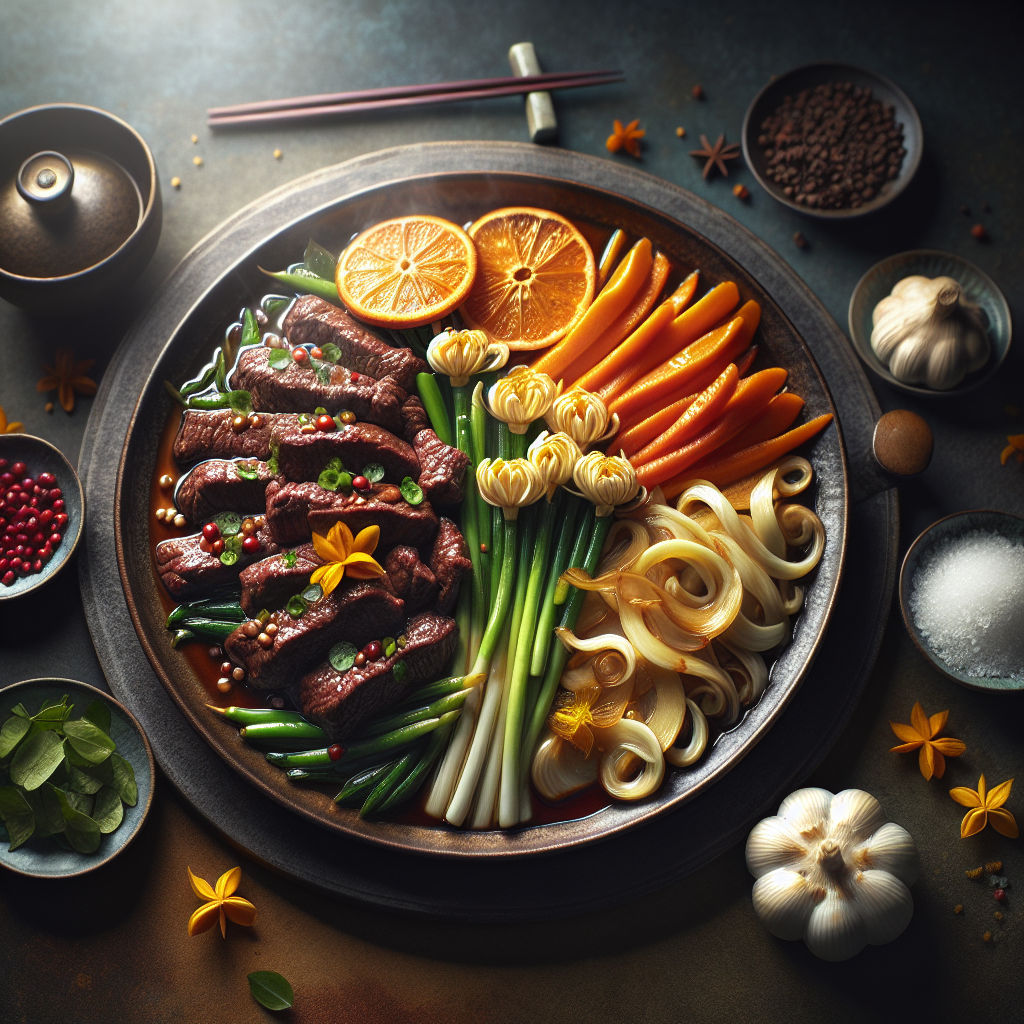 Chrysanthemum-Infused Halal Beef with Ginger and Tangerine Essence is a delightful dish that combines the floral aroma of chrysanthemum with the zesty and sweet notes of ginger and tangerine. Originating from Chinese cuisine, this dish is a harmonious blend of flavors that tantalizes the taste buds. The tender halal beef is infused with chrysanthemum tea, lending a subtle floral hint, while ginger adds warmth and tangerine essence offers a refreshing citrus kick. This dish is cherished for its unique taste profile and the aromatic experience it provides, making it a favorite for special occasions or a gourmet dinner at home. The use of halal ingredients ensures that it meets dietary requirements, allowing more people to enjoy its exquisite flavors.