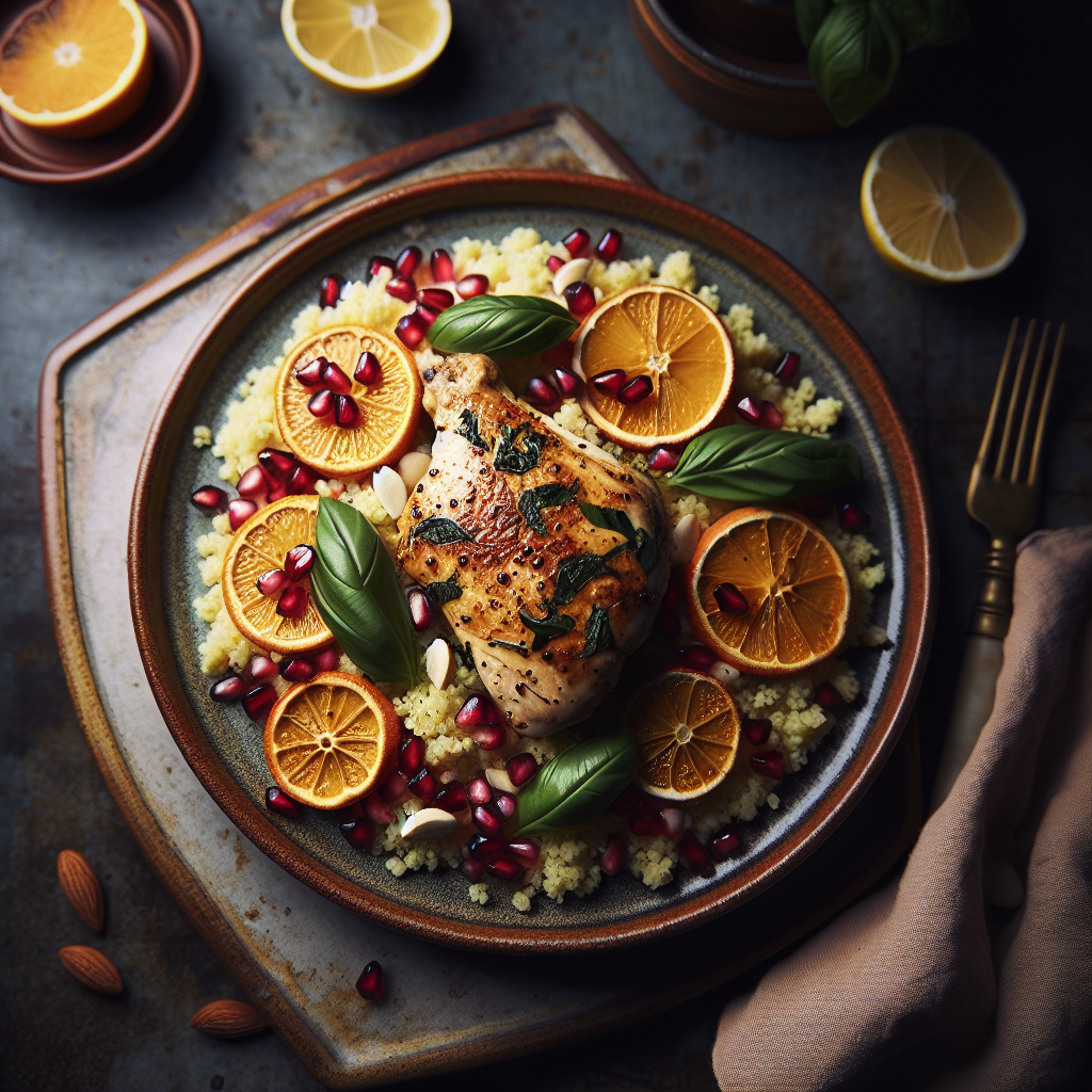 Citrus Basil Chicken with Pomegranate Almond Couscous is a delightful fusion dish, combining vibrant Mediterranean flavors with a touch of Middle Eastern flair. The chicken is marinated in a zesty blend of citrus and fresh basil, bringing a refreshing and aromatic taste to each bite. Paired with the nutty and slightly sweet Pomegranate Almond Couscous, this dish offers a harmonious balance of textures and flavors. The couscous is dotted with juicy pomegranate seeds and crunchy almonds, providing a delightful contrast to the tender chicken. Loved for its unique flavor profile and healthful ingredients, this dish is a perfect lunchtime treat that leaves you satisfied and invigorated. Its colorful presentation also makes it a favorite for hosting and sharing with friends and family.