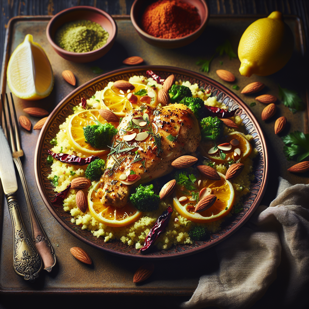 Citrus-Paprika Chicken with Almond Saffron Couscous is a delightful fusion of flavors inspired by Mediterranean and Middle Eastern cuisines. This dish features a juicy, paprika-spiced chicken infused with bright citrus notes, creating a vibrant and aromatic profile. Paired with a fluffy couscous enhanced by the nutty crunch of almonds and the golden hue of saffron, this meal offers a tantalizing experience for your taste buds. Loved for its zesty and aromatic qualities, it is perfect for a family dinner or a special gathering. The harmonious blend of spices and textures makes it a standout dish that is both comforting and exotic.
