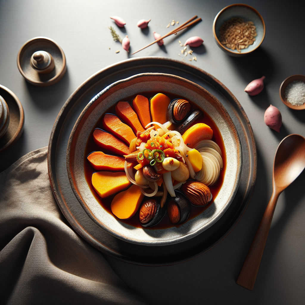 Dakdoritang, a beloved Korean dish, is a spicy chicken stew known for its robust flavors and comforting qualities. This version includes sweet potato and chestnut, adding a delightful sweetness and nutty texture to the dish. Originating from Korea, dakdoritang is loved for its harmonious blend of spicy, savory, and slightly sweet flavors, making it a perfect meal for any occasion. Key ingredients such as gochujang (Korean chili paste), soy sauce, and garlic create a rich, aromatic broth that envelops tender chicken pieces. The addition of sweet potatoes and chestnuts not only enhances the nutritional value but also provides a satisfying contrast to the spicy broth. This dish is a family favorite, often served bubbling hot, bringing warmth and satisfaction to the table.