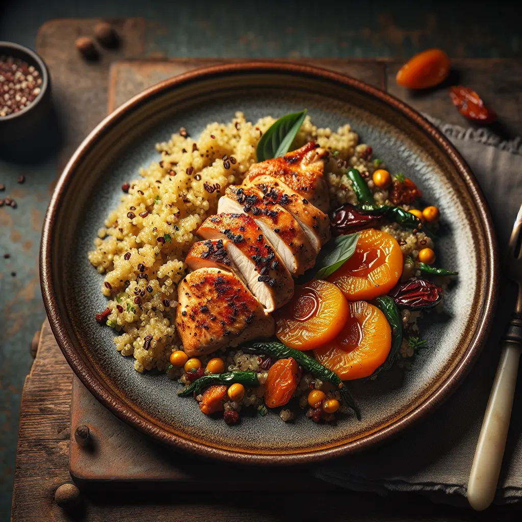Saffron-Date Chicken with Almond Herb Quinoa is a delightful fusion....