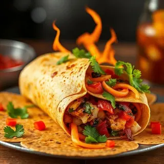 Fiery Fiesta Wrap is a deliciously spicy and savory wrap filled with a mix of seasoned chicken, fresh vegetables, and zesty sauces. Perfect for lunch or dinner, it offers a burst of flavors in every bite. Quick to prepare, it’s ideal for those who love bold and vibrant meals with a touch of heat.