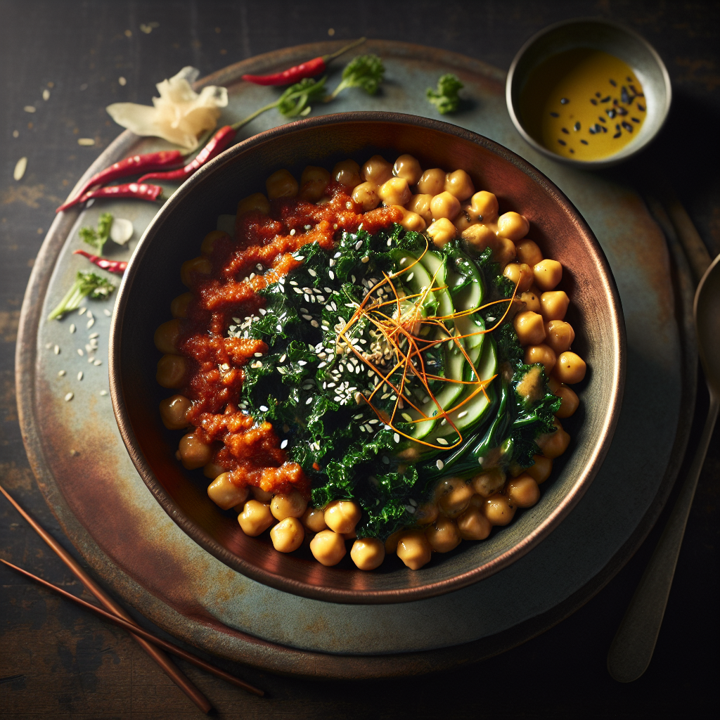 Gochujang Chickpea and Kale Bibimbap is a vibrant and nutritious Korean-inspired dish that combines the earthiness of chickpeas and the freshness of kale with the spicy kick of gochujang. Bibimbap, meaning ‘mixed rice’, is a traditional Korean meal that brings together a variety of ingredients, each contributing a unique flavor and texture. The addition of a sesame lime dressing adds a tangy and nutty flair, enhancing the complexity of the dish. This recipe is loved for its balance of flavors, its health benefits from the chickpeas and kale, and its ability to be customized with various toppings. Perfect for a satisfying lunch or dinner, it offers a fusion of tastes and a feast for the eyes.