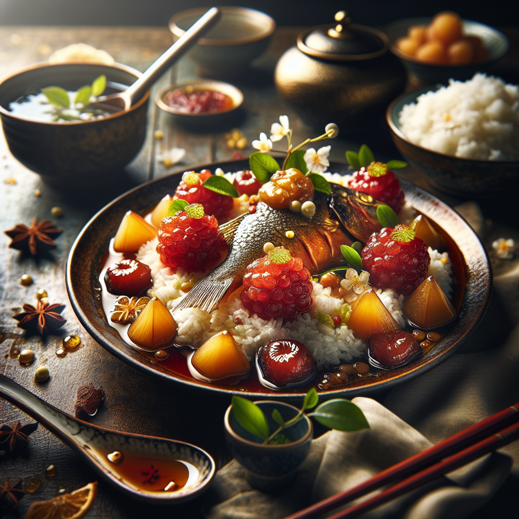 Jasmine Blossom-Infused Halal Fish with Lychee and Ginger Essence is a delightful Chinese dish that combines the delicate aroma of jasmine with the sweet and tangy flavors of lychee and ginger. The fish, infused with jasmine blossoms, offers a subtle floral note that pairs beautifully with the robust ginger essence. This dish is a celebration of balance, where the softness of the fish meets the juicy burst of lychees, creating a harmonious blend of textures and tastes. Its unique flavor profile makes it a favorite among those who appreciate sophisticated, aromatic dishes. The use of halal fish ensures the dish meets dietary preferences, making it a beloved choice at any dining table.