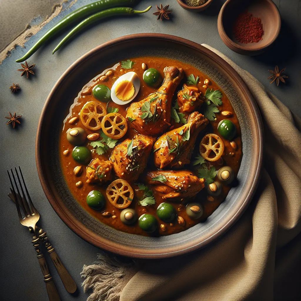 Kesar Pista Murgh Bhuna is a delicious Indian dish that combines the rich flavors of saffron and pistachios with tender chicken, creating a luxurious and aromatic meal. Originating from North India, this dish is loved for its unique blend of spices and creamy texture. The chicken is cooked to perfection in a fragrant sauce made with onions, garlic, and ginger, then garnished with pistachios and a hint of saffron for an exotic twist. It is an indulgent dish that pairs beautifully with naan or rice, making it a perfect choice for special occasions or when you want to impress your guests with something truly exquisite.