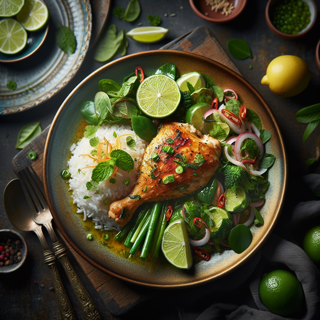 Lemongrass Lime Chicken with Thai Herb Salad is a delightful fusion of flavors that brings the essence of Thai cuisine to your dining table. This dish combines tender chicken infused with aromatic lemongrass and zesty lime juice, creating a refreshing and tangy taste profile. The accompanying salad, rich with Thai herbs such as mint, cilantro, and basil, adds a fresh and vibrant note to the dish. This recipe is loved for its balance of savory and citrusy flavors, appealing to those who enjoy bold and exotic tastes. Perfect for a family meal or entertaining guests, it is both flavorful and healthy, making it a popular choice among food enthusiasts who appreciate authentic Thai culinary experiences.