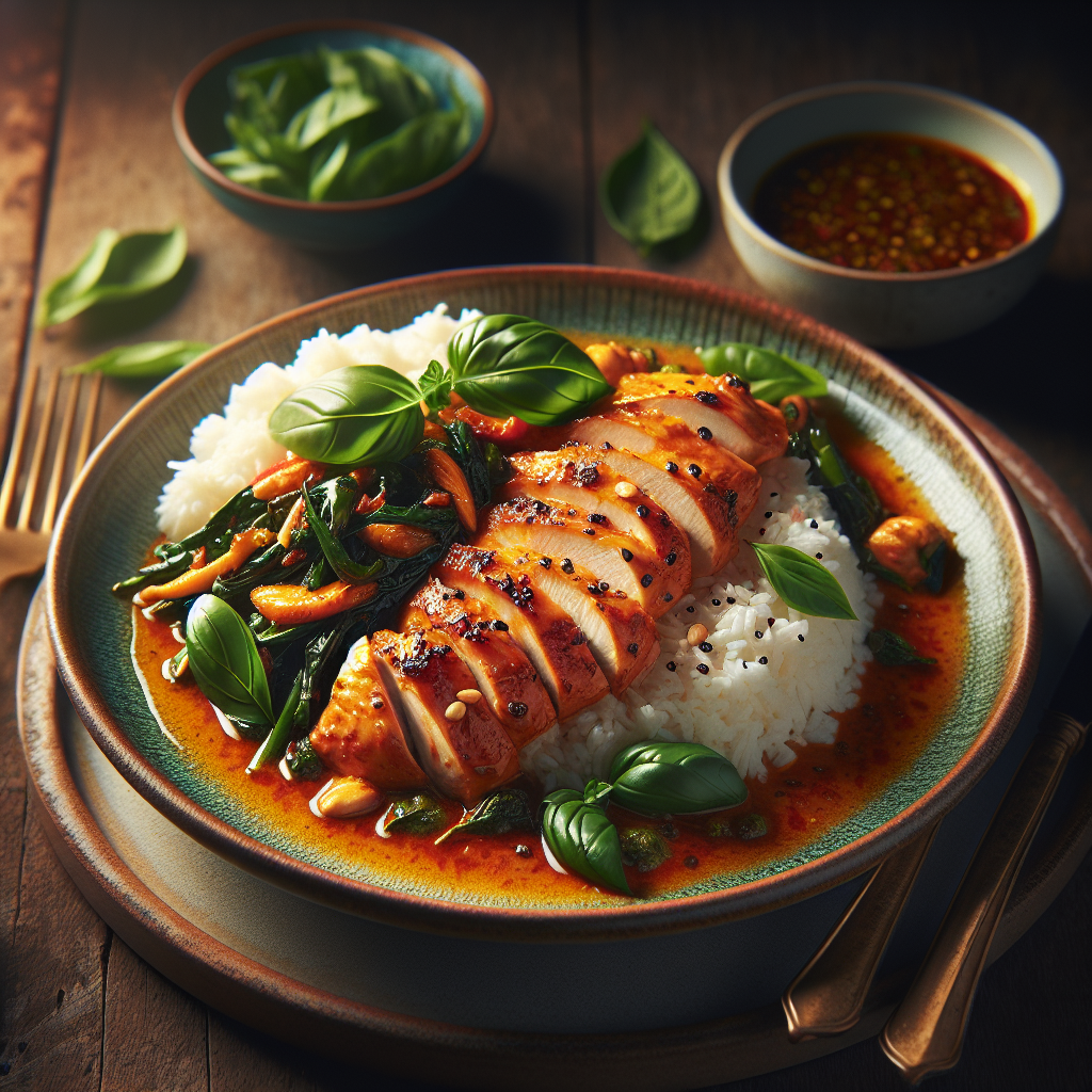 Mango Tamarind Chicken with Thai Holy Basil and Coconut Rice is a delightful fusion of sweet, tangy, and aromatic flavors, offering a taste of authentic Thai cuisine. This dish combines succulent chicken pieces with a vibrant mango and tamarind sauce, enhanced by the aromatic Thai holy basil. Served alongside fragrant coconut rice, it provides a perfect balance of sweet and savory notes. The tropical sweetness of mango blends harmoniously with the sour tamarind and spicy hints of basil, creating an irresistible taste experience. Loved for its exotic flavors and satisfying combination of textures, this dish is perfect for those seeking a culinary adventure from the comfort of their home.