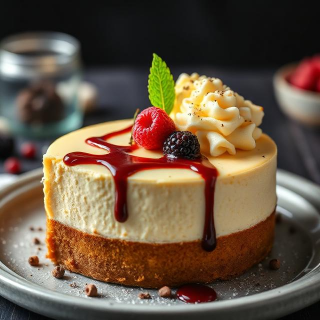 New York Cheesecake is a classic American dessert known for its rich, dense, and ultra-creamy texture that sets it apart from lighter cheesecakes. This version is baked slowly to achieve a smooth interior with a slightly golden surface, creating a perfect balance between firmness and silkiness. The simple ingredient list allows the flavor of cream cheese to shine without distractions. A crisp crust provides gentle contrast to the velvety filling, making each bite indulgent yet balanced. Traditionally served plain, this cheesecake is satisfying on its own and does not rely on toppings or sauces. Its timeless appeal makes it a popular choice for celebrations, family gatherings, or whenever a luxurious dessert is desired.
