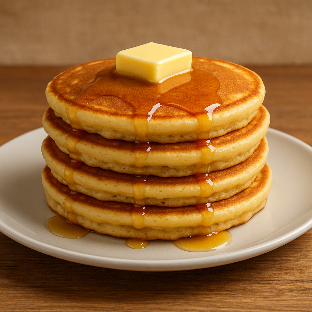 Pancakes are a popular breakfast dish made with a simple batter of flour, milk, egg, and baking powder. Cooked on a flat pan until golden, they are light and fluffy inside with a soft texture. Pancakes can be enjoyed with syrup, honey, or fruit and are loved by all age groups.