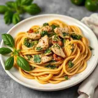 Pesto Chicken Pasta is a delightful combination of tender chicken pieces and al dente pasta coated in a rich, flavorful pesto sauce. This recipe balances the freshness of basil with the nutty taste of Parmesan, creating a hearty yet refreshing meal. Perfect for lunch or dinner, it brings comfort and elegance to your table while being simple to prepare.