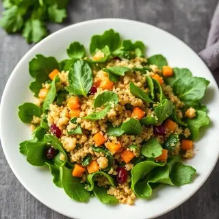 Quinoa Spinach Arugula Salad is a wholesome and nourishing dish that combines hearty grains with vibrant greens for a balanced, satisfying meal. The fluffy quinoa pairs beautifully with tender spinach and peppery arugula, creating a refreshing mix of textures and flavors. Lightly tossed with simple ingredients, this salad offers a clean, natural taste while delivering plant-based protein, fiber, and essential minerals. It works well as a light lunch, a healthy side dish, or a quick dinner option. Easy to prepare and versatile, this salad can be enjoyed warm or chilled, making it perfect for busy days when you want something nutritious, energizing, and delicious without spending too much time in the kitchen.