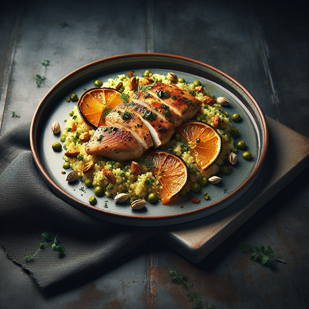Saffron-Clove Chicken with Pistachio Orange Couscous is a vibrant and aromatic dish that brings together the rich and exotic flavors of the Middle East. The chicken is marinated in a fragrant blend of saffron and cloves, which infuses the meat with a warm and spicy aroma. Paired with a fluffy couscous that is studded with crunchy pistachios and sweet, juicy orange segments, this dish offers a delightful contrast of textures and tastes. The combination of spices and citrus creates a harmony that is both comforting and invigorating, making it a favorite for those who enjoy bold and unique culinary experiences. Perfect for a special dinner, this dish is as pleasing to the eye as it is to the palate.