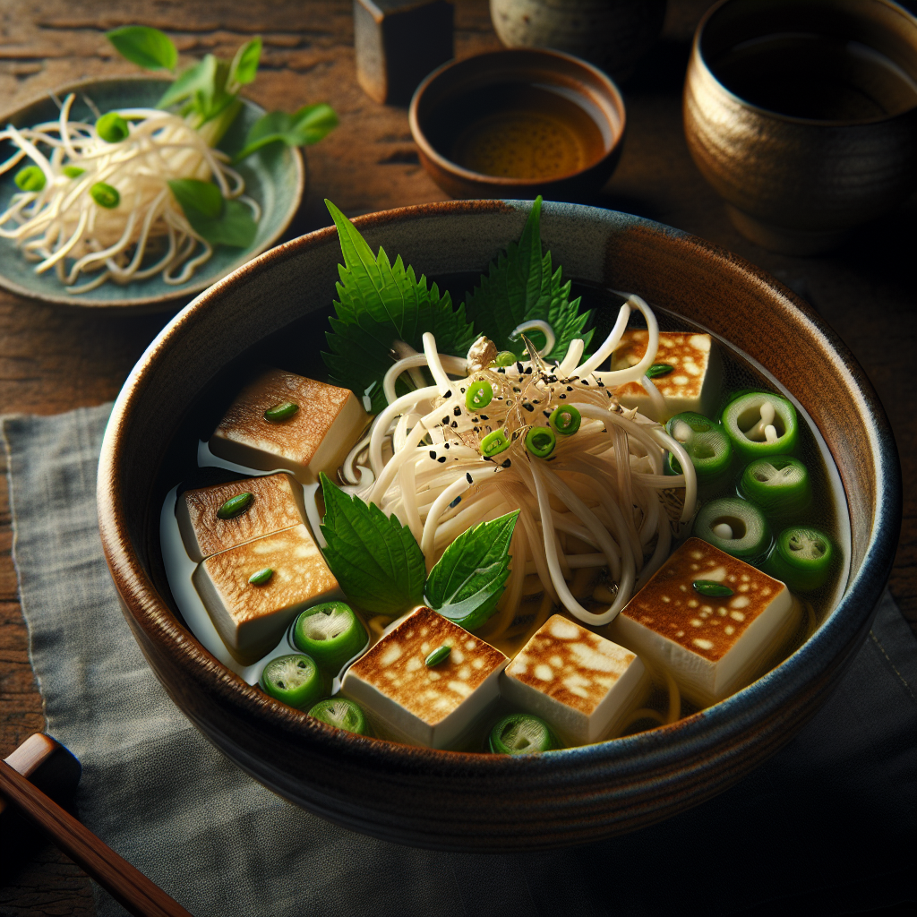 Shiso Yuzu Tofu Miso Soup with Enoki and Mitsuba is a delightful Japanese dish that combines the aromatic flavors of shiso leaves with the zesty tang of yuzu. This soup offers a comforting and nourishing experience, perfect for any season. The tofu provides a soft and smooth texture, while the enoki mushrooms add a subtle earthiness. Mitsuba, a Japanese herb, enhances the soup with its fresh, parsley-like flavor. The miso paste forms the backbone of the soup, delivering a rich umami taste that is both savory and satisfying. Loved for its balance of flavors and health benefits, this soup is not only delicious but also a feast for the senses. Ideal for those seeking a light yet flavorful meal.