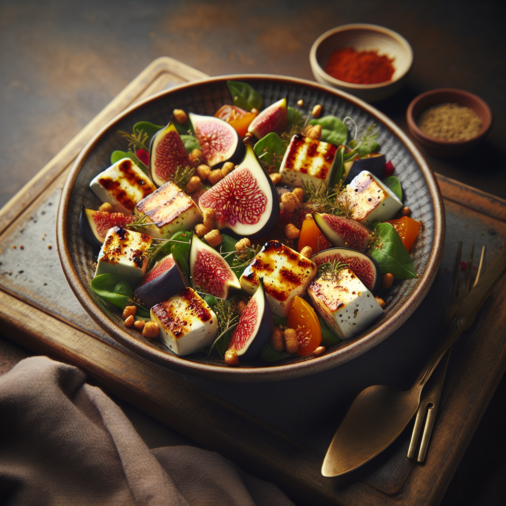 Sumac Spiced Halloumi & Fig Salad is a delightful fusion of Mediterranean flavors, combining the tangy, lemony taste of sumac with the creamy, salty profile of halloumi cheese. Originating from Middle Eastern cuisine, this salad is a refreshing blend of textures and flavors: juicy figs, crunchy walnuts, and crisp greens. The dish is not only visually appealing but also rich in nutrients, making it a favorite for those who seek both taste and health in their meals. The sumac spice adds a unique zest, while the figs contribute a natural sweetness. Loved for its balanced taste and vibrant presentation, this salad is perfect for a light lunch or an appetizer at a dinner party.