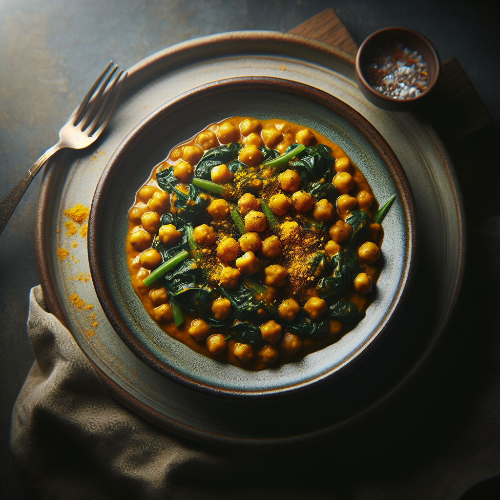 Turmeric-Spiced Chickpea and Spinach Stew is a hearty, comforting dish with roots in Middle Eastern and North African cuisines. It combines nutrient-rich chickpeas, earthy spinach, and aromatic spices like turmeric, cumin, and coriander, creating a vibrant, flavorful stew. Chickpeas provide a rich source of protein and fiber, while spinach adds a burst of vitamins and minerals. The turmeric gives the stew its distinctive golden hue and offers anti-inflammatory benefits. This dish is beloved for its warm, spicy aroma and wholesome taste, making it a perfect choice for a nourishing dinner. Enjoy it with warm flatbread or over rice for a complete meal.