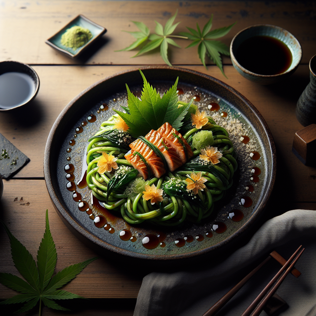 Yuzu Hijiki Nimono with Shiso Leaves is a delightful Japanese dish that combines the earthy flavors of hijiki seaweed with the citrusy notes of yuzu. Hijiki, a staple in Japanese cuisine, is valued for its unique texture and health benefits, including high fiber and mineral content. The dish is gently simmered with soy sauce, mirin, and dashi, infusing the seaweed with rich umami flavors. The addition of shiso leaves introduces a fresh, herbal aroma that complements the yuzu perfectly. This nimono is beloved for its balance of flavors and textures, offering a taste of traditional Japanese cooking that is both nutritious and satisfying.