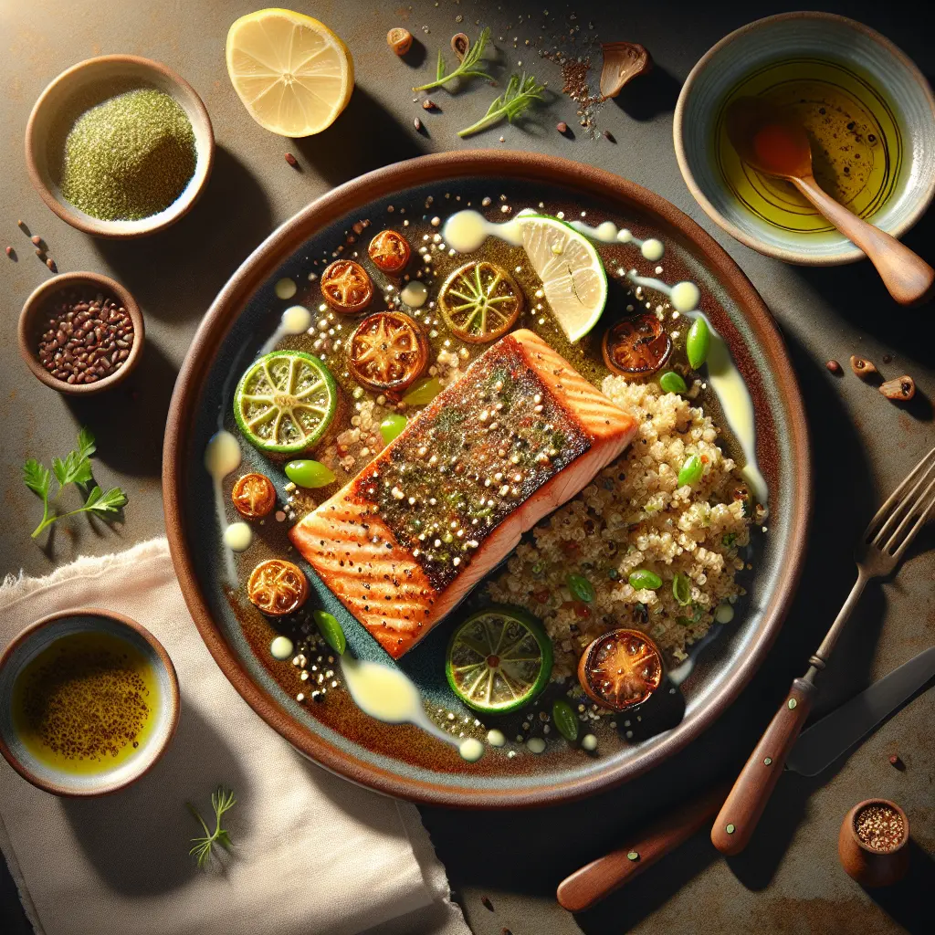 Zaatar-Lime Salmon with Herb Quinoa is a delightful fusion dish that brings together Middle Eastern and Western flavors. The zaatar spice blend, known for its aromatic mix of thyme, sesame seeds, and sumac, adds a unique tangy and earthy flavor to the salmon, perfectly complemented by the brightness of lime. Paired with herb-infused quinoa, this dish is both nutritious and satisfying. The quinoa is cooked with fresh herbs, enhancing its nutty taste and making it a perfect bed for the flavorful salmon. Loved for its balance of flavors and ease of preparation, this dish is ideal for a healthy dinner option that doesn’t compromise on taste.